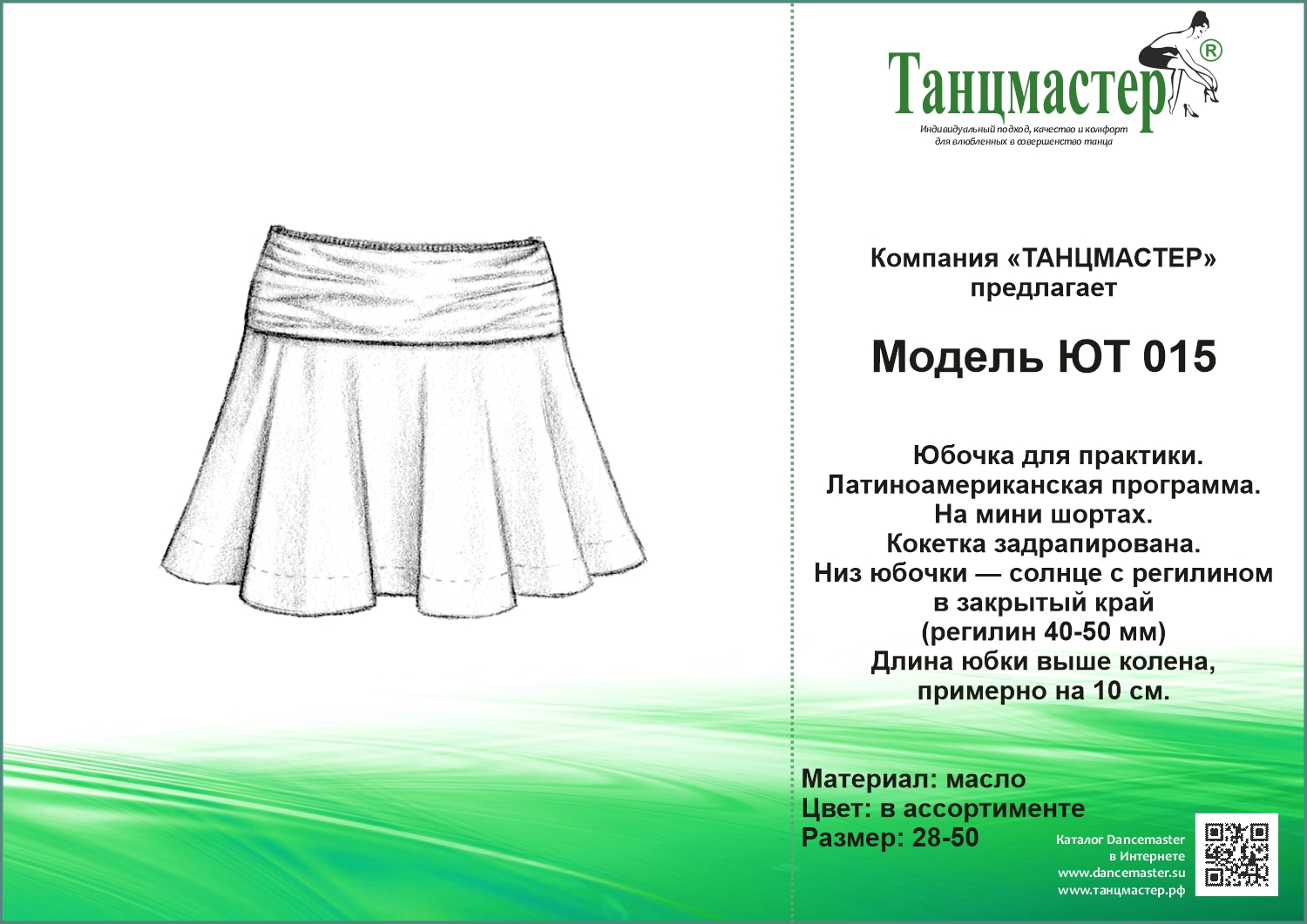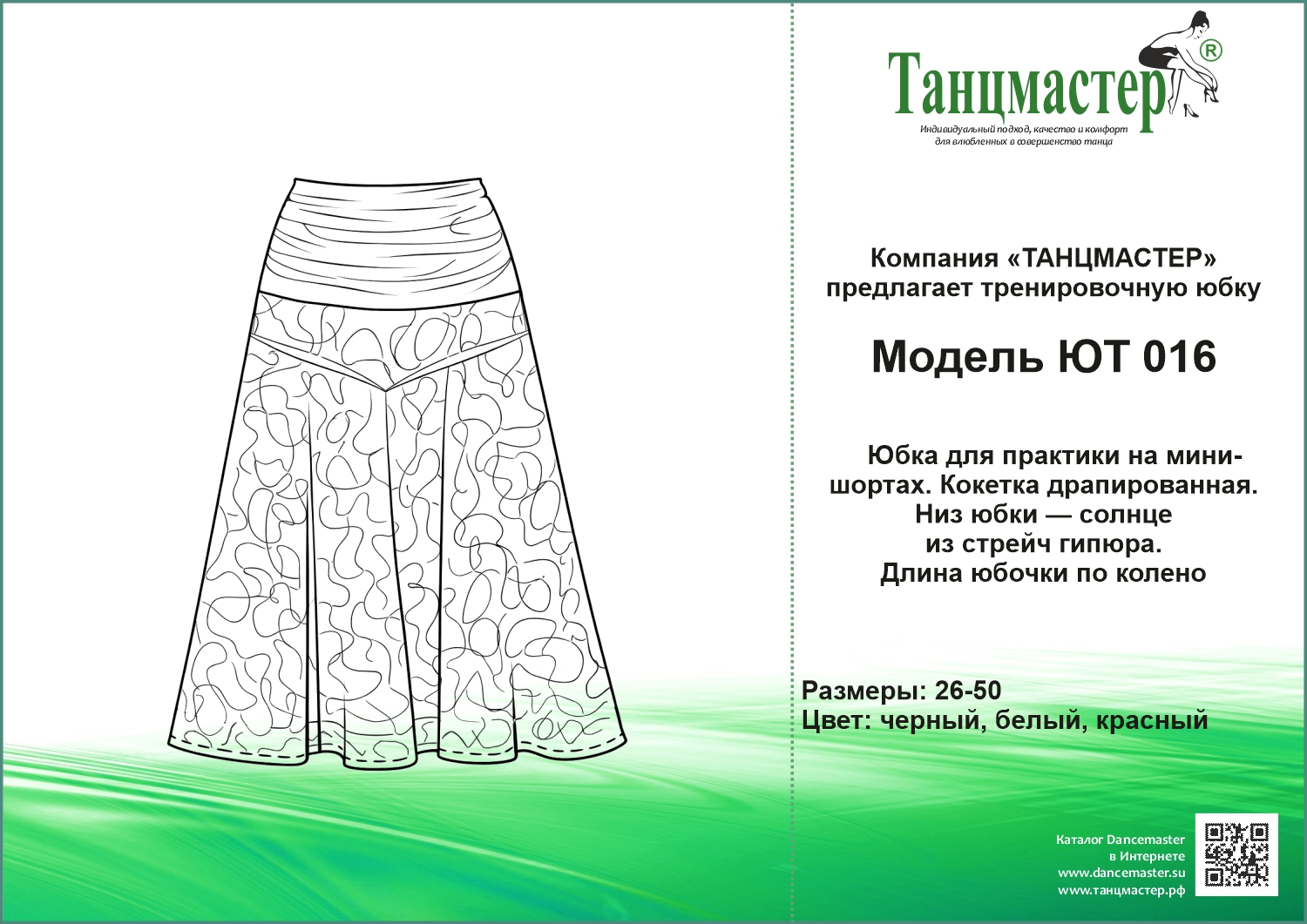 Юбка тренировочная, длина - по-икру. Кокетка – двухслойная, на скрытой резинке. Полотнище юбки - солнце. Центральная часть переднего и заднего полотнища чуть длиннее, чем боковая.